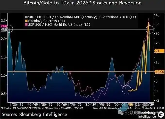 Second, the relative pricing relationship between Bitcoin and gold. McGlone特别强调 the Bitcoin/Gold ratio. This ratio was about 10x at the end of 2022, then expanded rapidly driven by the bull market, reaching over 30x in 2025. But this year, the ratio has fallen about 40%, dropping to around 21x. In his view, if deflationary pressures persist and gold remains firm due to safe-haven demand, it is not an激进假设 for the ratio to further return to its historical range.