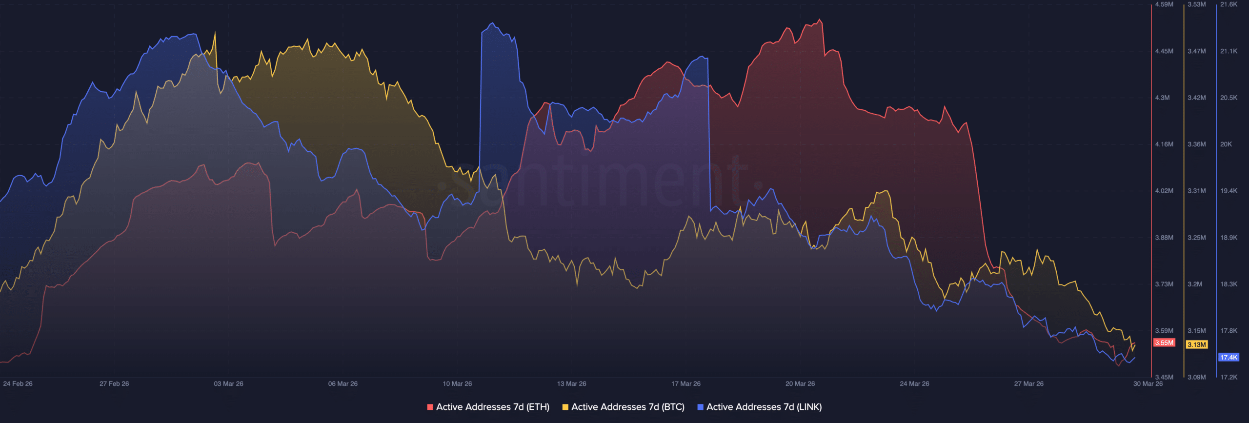 However, the active address mapping of BTC, LINK, and ETH shows a major drop in retail activity. This shows that despite a rise in trends, the metrics are not in favour, and investors are still cautious.
