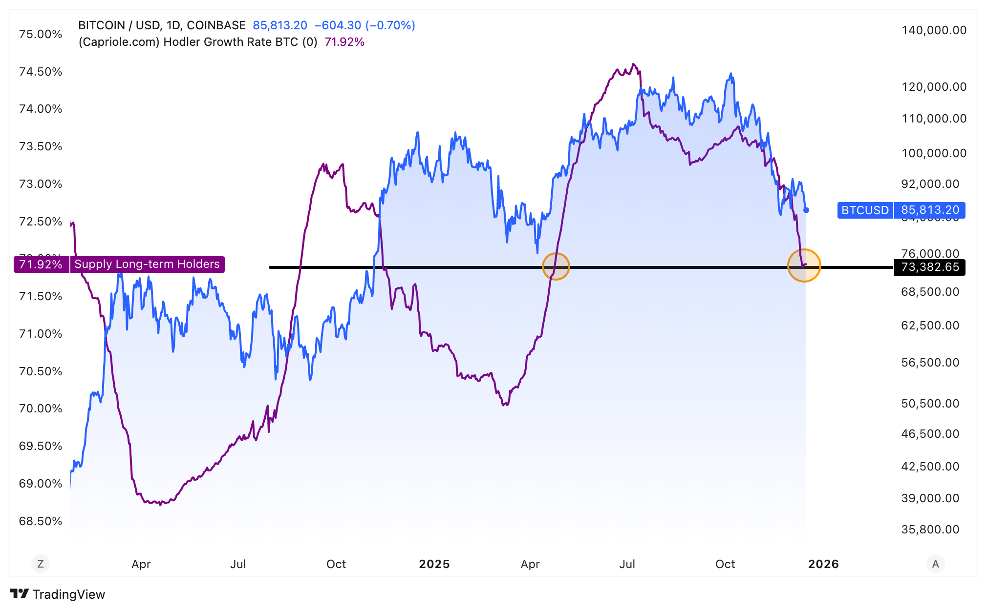 Chart of Bitcoin Long-Term Holder Supply Percentage Change, Source: Capriole Investments