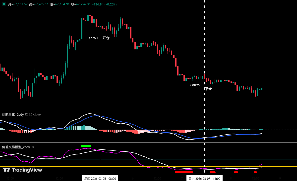 • Exit: The price fell to near $68,000, and the Spread Trading Model triggered a bottom warning signal (red dot in the chart). The position was fully closed near $68,095.