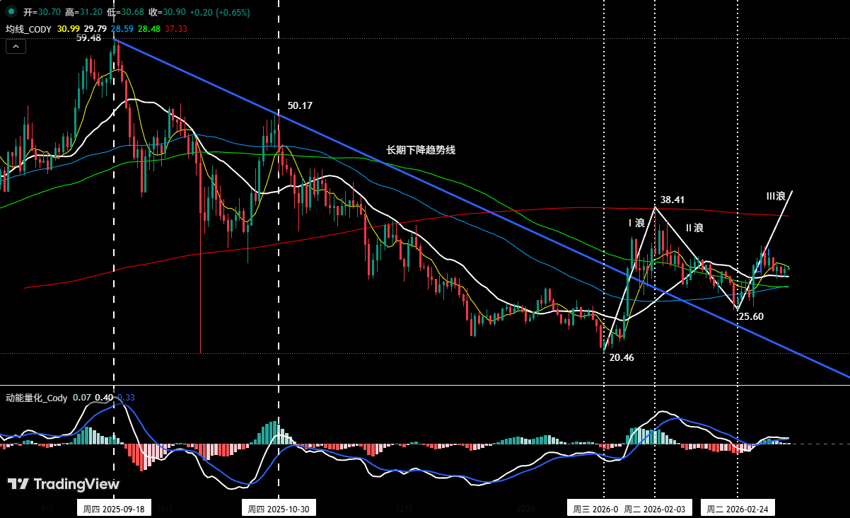 • Wave II (Corrective Wave): From the high of $38.41 on February 3 to the low of $25.60 on February 24, lasting 20 days, with a maximum decline of 33.35%.