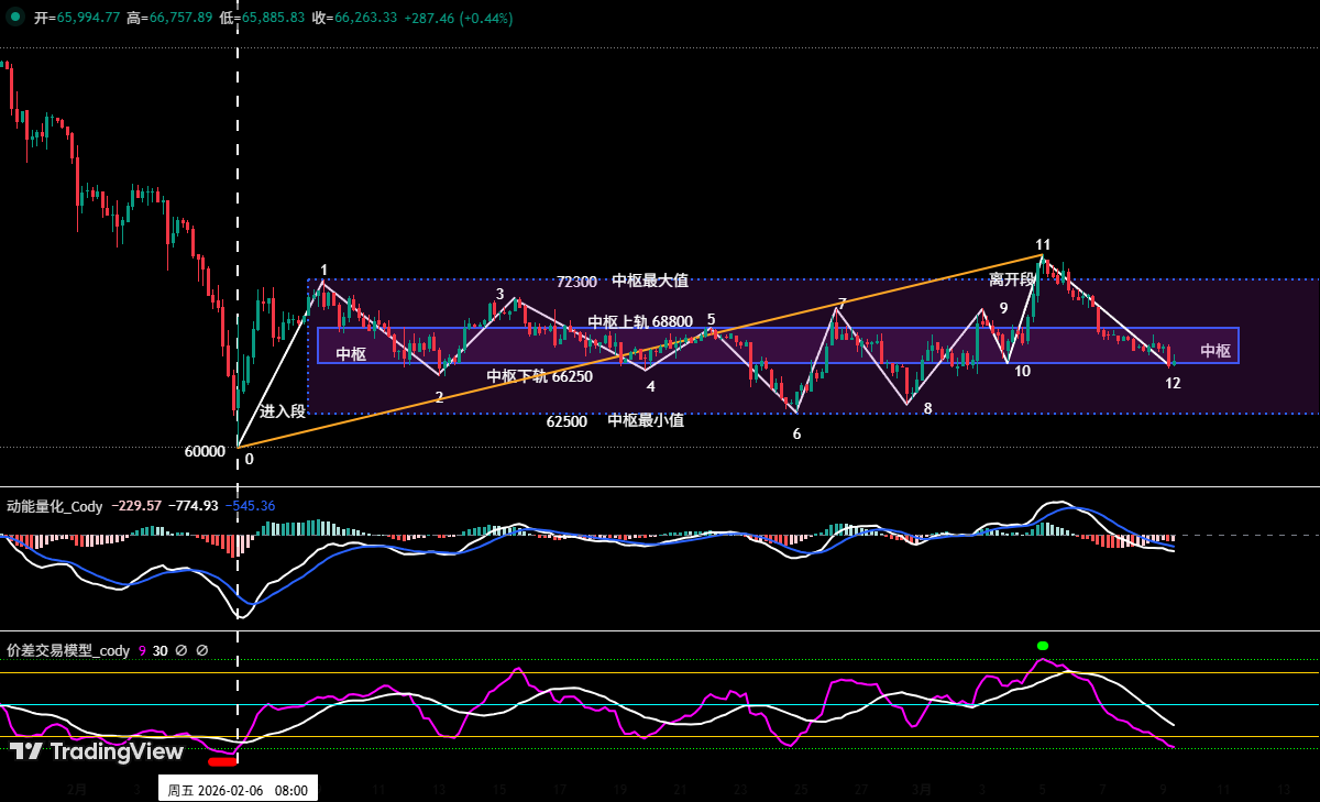 • Central Pivot Construction: As seen in (Figure 6): The "Upward Central Pivot" structure is basically formed. Its highest resistance is around $72,300, and the lowest support is around $62,500; the upper轨 (rail) of the pivot is around $68,800, and the lower轨 (rail) is around $66,250.