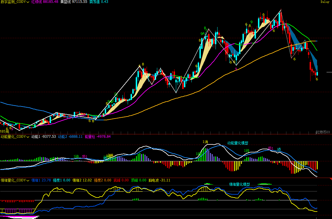 Comprehensive Analysis: After analyzing the data from the Momentum Quantification and Sentiment Quantification models, we believe the technical structure of Bitcoin's daily bearish trend has not changed. The current行情 (market movement) is an oversold rebound, and due to disordered buying momentum, cautious market sentiment, and low capital participation, this rebound is weak with poor sustainability.