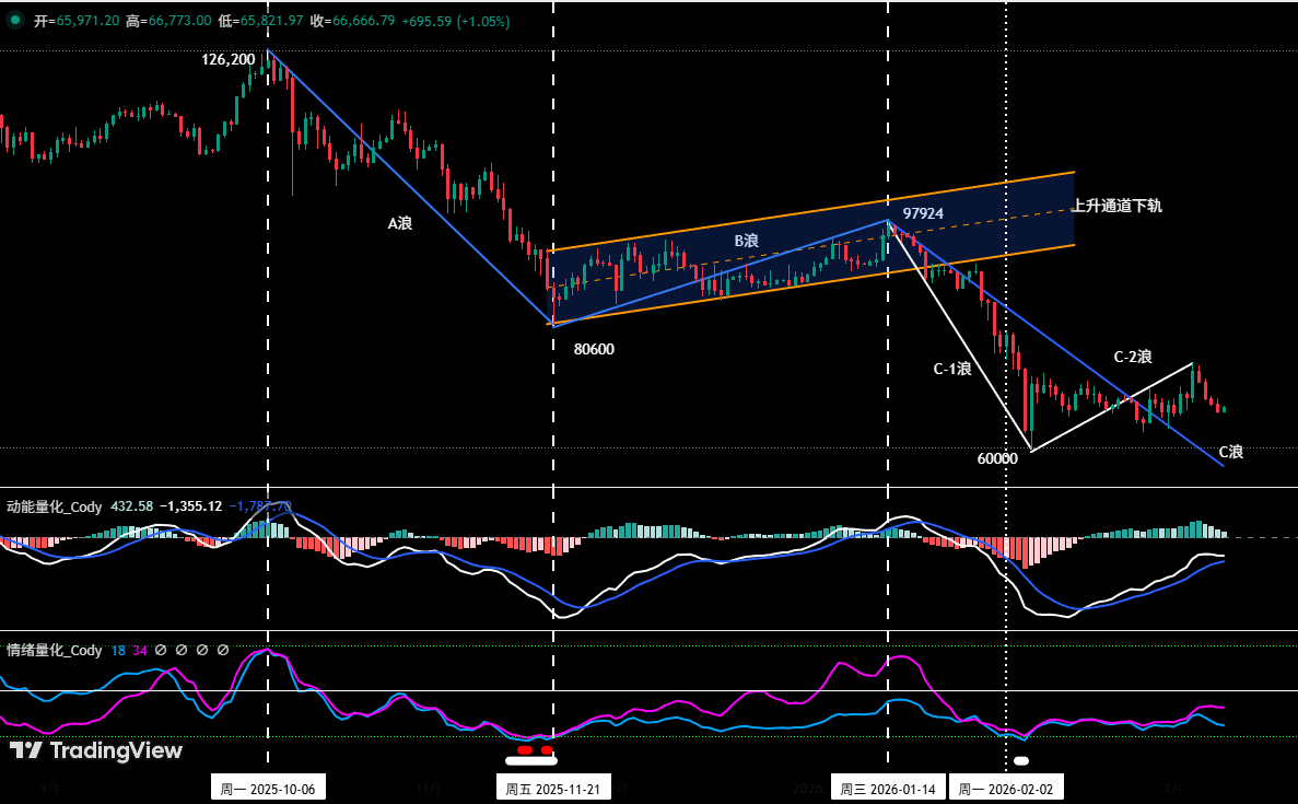 • We maintain the previous core analysis framework: The upward move in Bitcoin starting from the low on February 6 (approx. $60,000) is, in nature, an oversold rebound within the large-scale C wave correction, specifically the C-2 wave. This is expected to be followed by a C-3 wave corrective行情 (market movement).