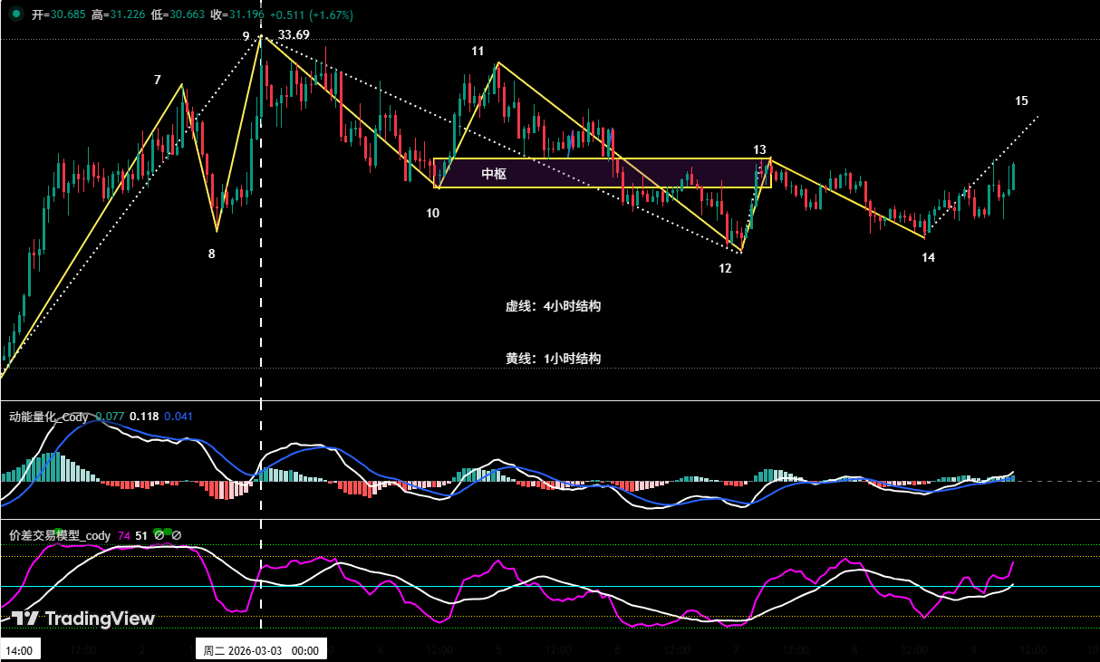 2、 Short-term Strategy: Use 30% of the position, set stop-loss points, and look for "spread" opportunities based on support and resistance levels. (Use 30-minute/60-minute as the operation cycle).