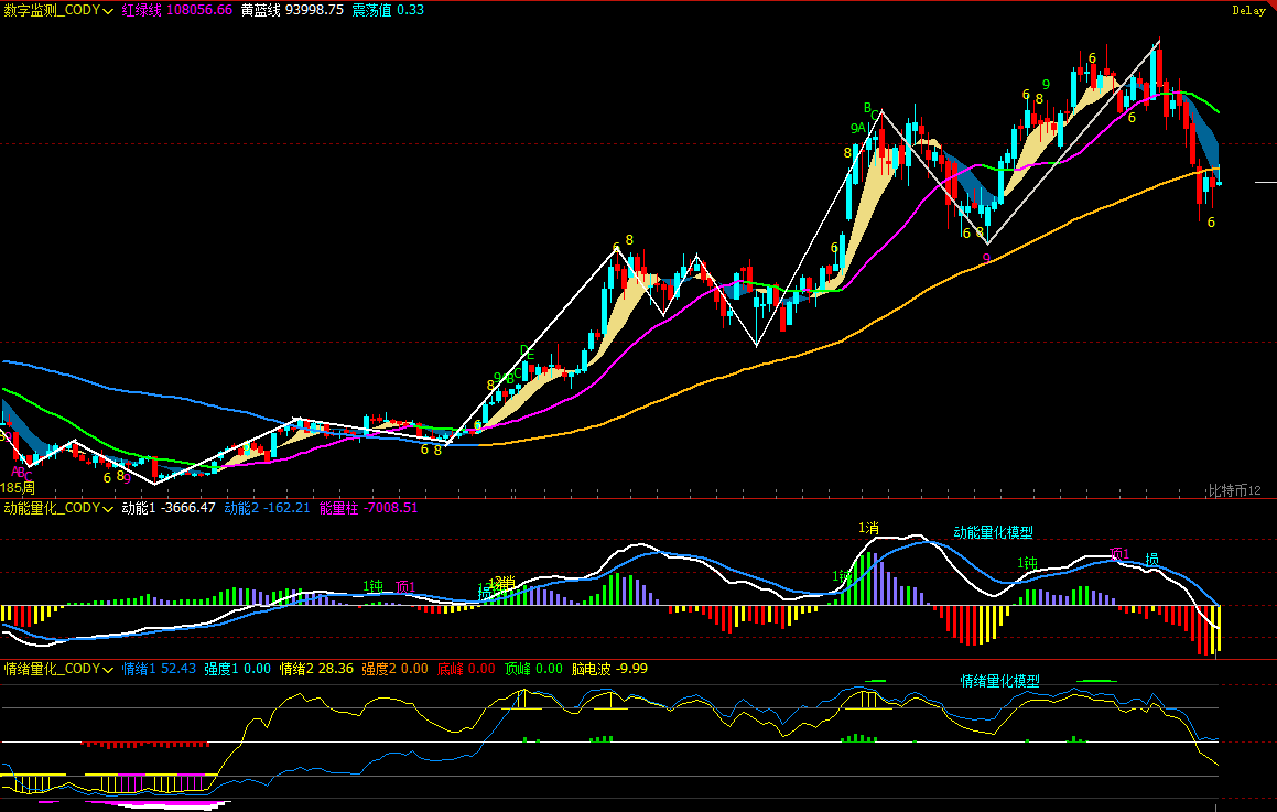 比特币周 K 线图:(动能量化模型+情绪量化模型)
