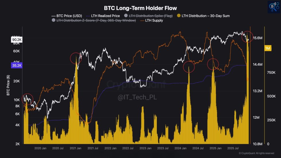 Following a research of the BTC Long-Term Holder Flow metric, IT Tech, an on-chain analyst and author at CryptoQuant, revealed that these investors are unloading their coins. This time, they are unloading into strength, triggering questions about BTC’s next price direction.