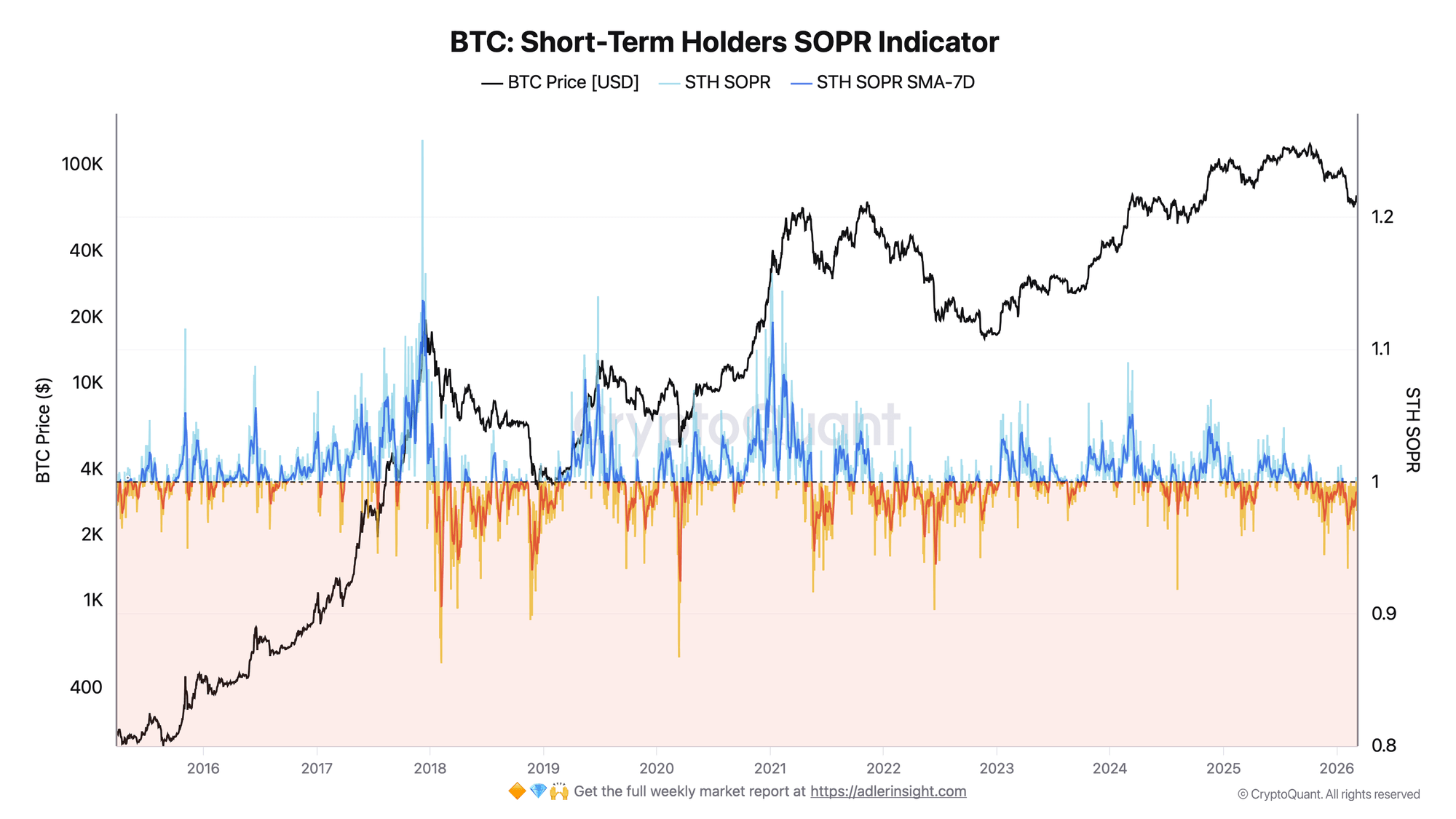 According to analysis shared by on-chain analyst Axel Adler, recent data shows that short-term holders are continuing to realize losses at a sustained pace. The Bitcoin Short-Term Holder Spent Output Profit Ratio (STH SOPR) has remained below the neutral threshold of 1.0 for seven out of the last eight days. This metric compares the selling price of recently moved coins to their original purchase price, meaning readings below 1.0 indicate that investors are selling at a loss.