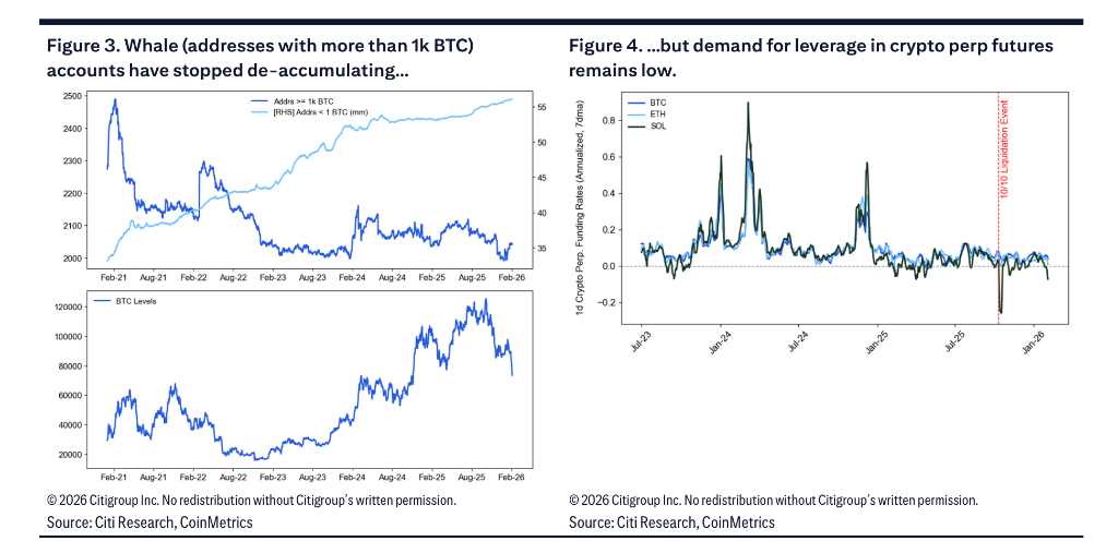 期货市场仍存在多头清算的空间。尽管自去年10月大幅上涨以来已经历多轮清算,花旗数据显示,交易所仍在发现多头头寸被平仓。对加密货币永续期货的杠杆需求仍然低迷。