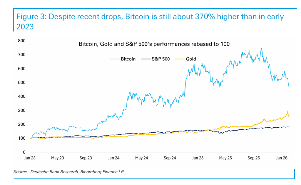 尽管近期跌幅显著,比特币较2023年初仍上涨约370%。德银指出,当前调整更多反映的是过去两年投机性涨幅的回撤,而非基本面的崩溃,但加密市场正面临从"信仰驱动"向"价值锚定"的艰难过渡。
