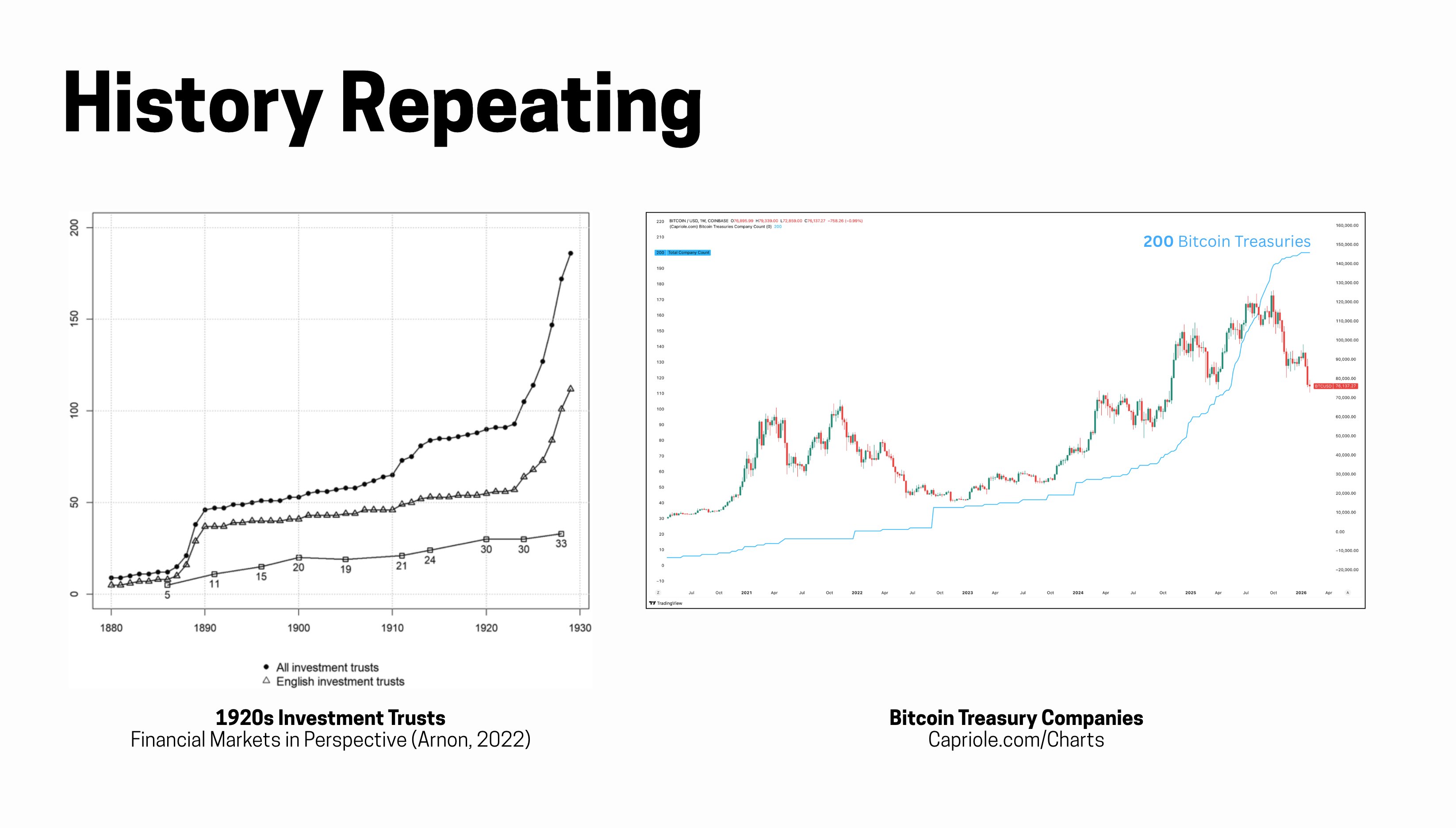 At the end of 1929, there were around 600 investment trusts, while today, Bitcoin DATs number at about 200. Thus, BTC DATs are still behind in count. “How big can the DAT bubble grow? That’s the million dollar question,” said the Capriole founder, noting that the trust bubble went on for nearly a decade.