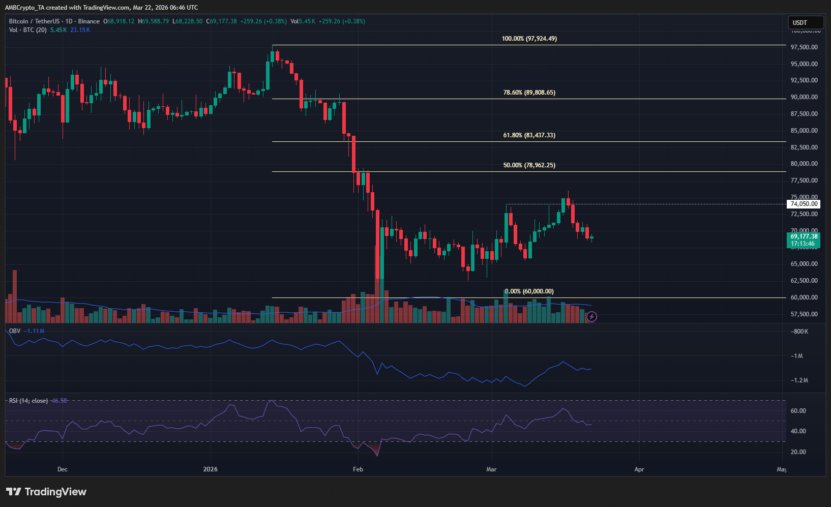 Volatility during weekends continued to threaten short-term holders and traders. The most recent price drop to $68.2k on Sunday, the 22nd of March, triggered $111.4 million in long liquidations in 24 hours.