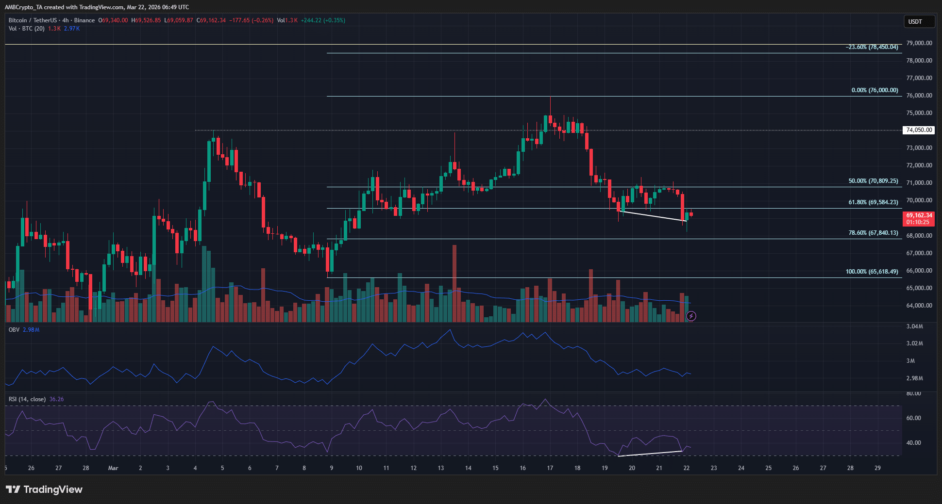 However, the downtrend in the OBV over the past week was telling of steady bearish pressure. If it continues and forces a price drop below $65.6k, the bullish idea outlined here would be invalidated.