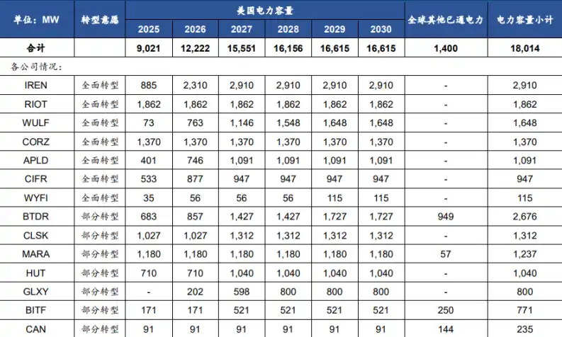 14 major US-listed mining farm companies are expected to reach a power capacity of 15.6GW by 2027. Their transition business models are primarily cloud computing leasing and IDC power leasing.