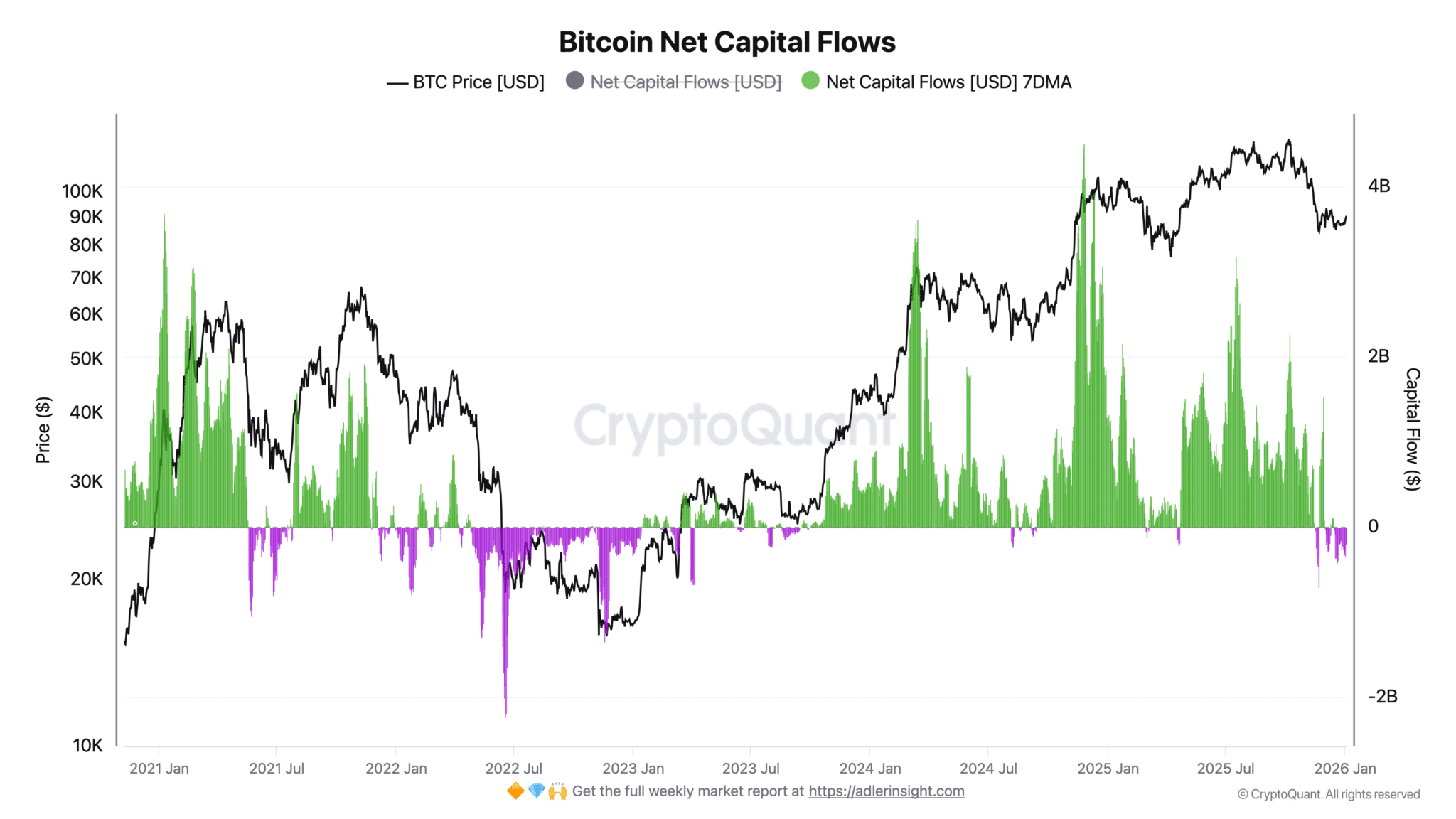 分析师 Axel Adler 观察到,从 12 月 26 日至 1 月 3 日,整体资本流动持续为负。这意味着已实现亏损超过已实现收益,其中 12 月 26 日压力达到峰值。