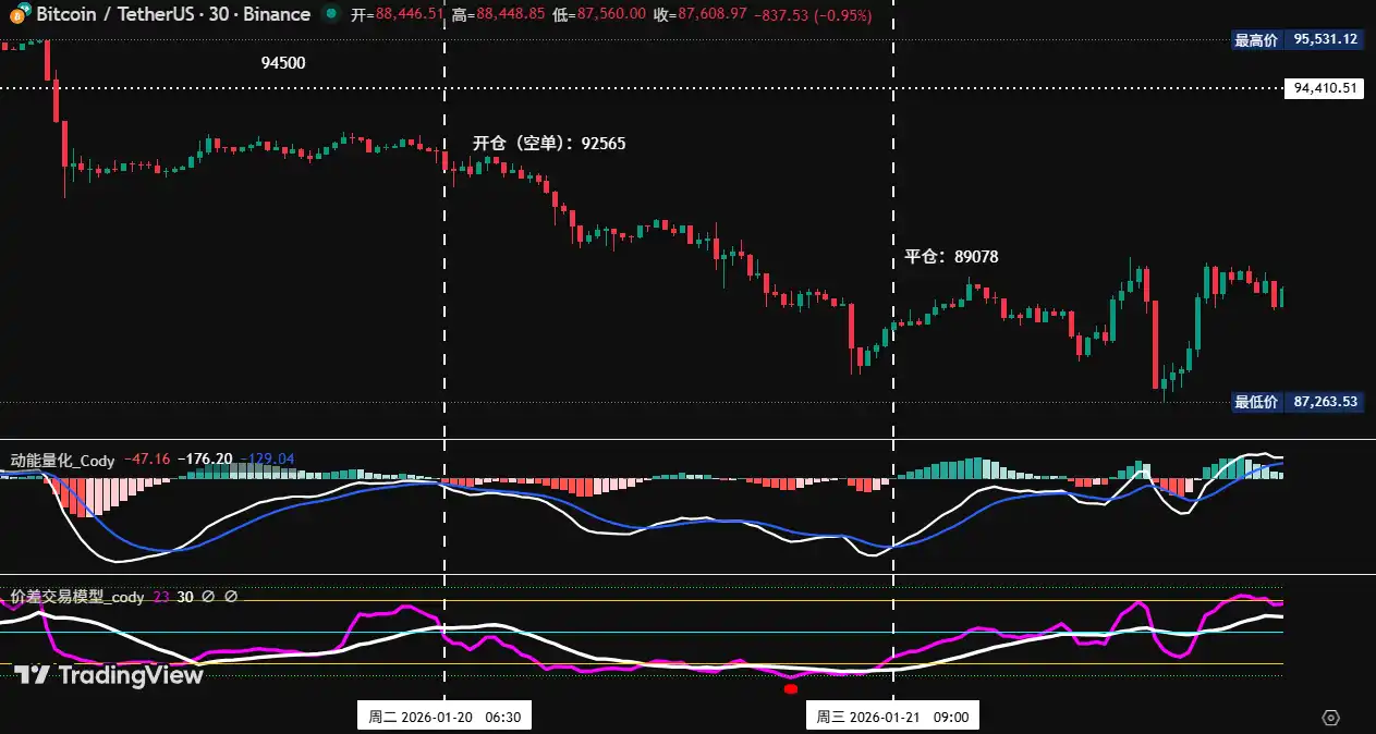 • First transaction (Profit 3.76%): This operation executed Plan B (Effectively break below the key area to go short) strategy: When the price fell below the $94,500~$95,000 area and反弹无力,同时 the spread trading model and momentum model共振 triggered a top signal,叠加 the two momentum lines formed a dead cross below (near) the zero axis, constituting a triple bearish signal. Based on this, we established a 30% short position at $92,565. Subsequently, the market trend adjusted as expected. When the price fell to an important support level, the spread model率先 issued a触底预警 signal (red dot), followed by the momentum quantitative model and spread trading model共振 again generating a bottom signal. Based on this, we平仓 all positions at $89,078, achieving the expected profit target.