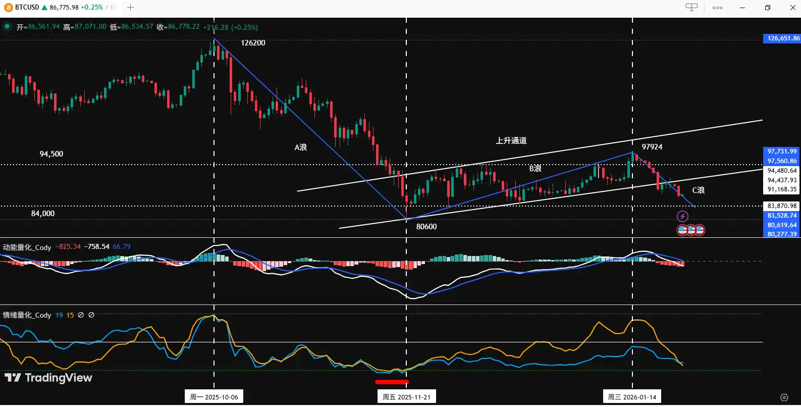 • B-wave rebound: $80,600 (2025-11-21) to $97,924 (2026-01-14), lasting 54 days, a rise of 21.5%, this stage belongs to technical repair.
