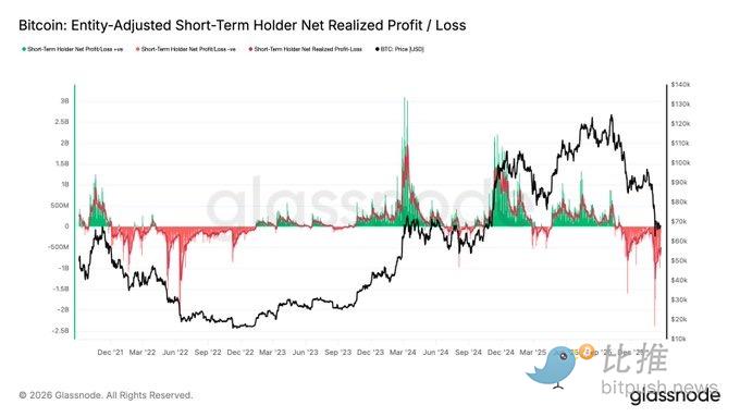 Glassnode notes that the 7-day average net realized profit/loss for investors (short-term holders) has narrowed from -$1.24 billion/day on February 6th to -$480 million/day, indicating that loss-selling is weakening but has not yet ended.