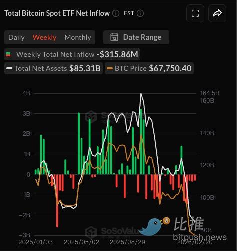 According to SoSoValue data, for the week ending February 20th, US spot Bitcoin ETFs recorded approximately $316 million in net outflows; Ethereum ETFs saw about $123 million in net outflows. This marks multiple consecutive weeks of net capital withdrawal.