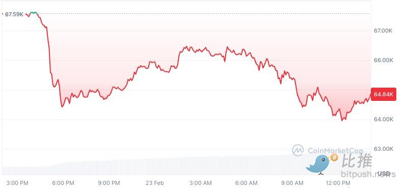 This past weekend, the crypto market found no respite. After a narrow-range consolidation on Saturday and Sunday, Bitcoin came under renewed pressure during today's European and American trading hours, briefly falling below the $64,000 mark to hit $63,924.44, setting a new low since February 6th. At the time of writing, the price has rebounded slightly to around $64,800, with a nearly 4% drop over 24 hours.