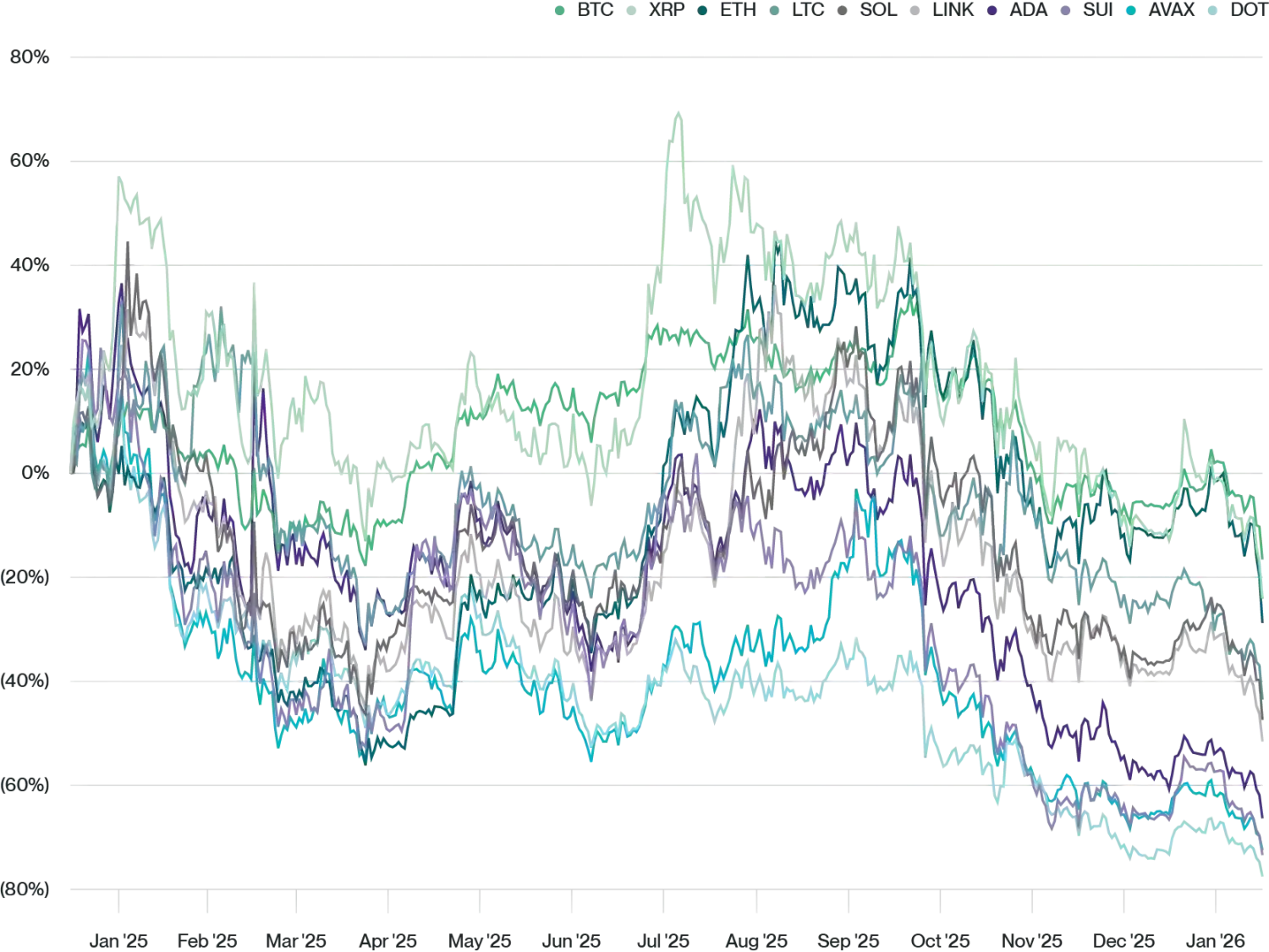 · Third-category assets (ADA, AVAX, SUI, DOT) were decimated, down 61.9% to 74.7%