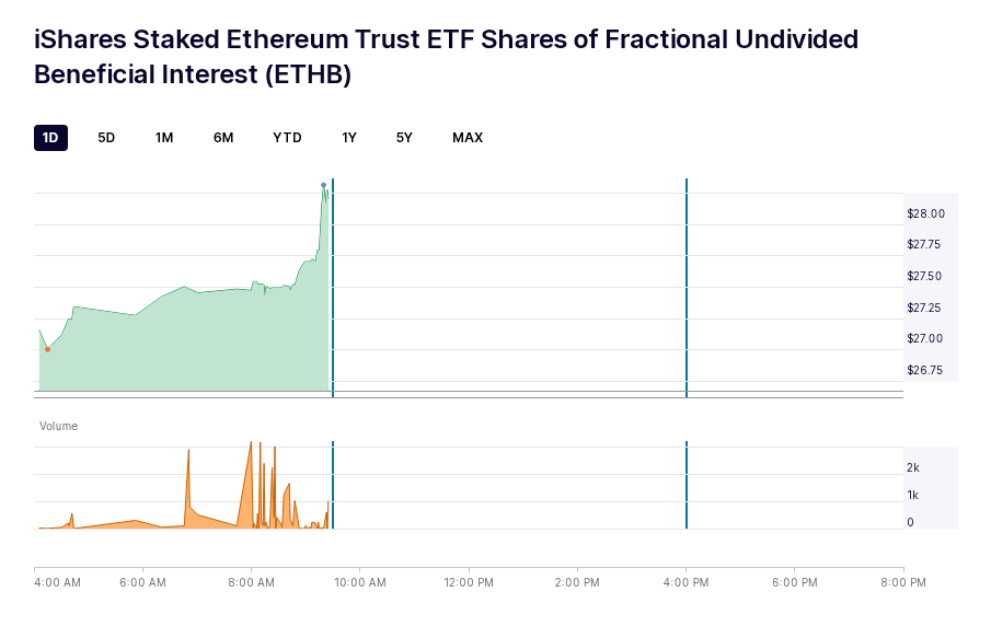 The fund launched Thursday on Nasdaq under the ticker ETHB, giving everyday investors a regulated way to hold Ether and collect staking rewards without managing a crypto wallet.