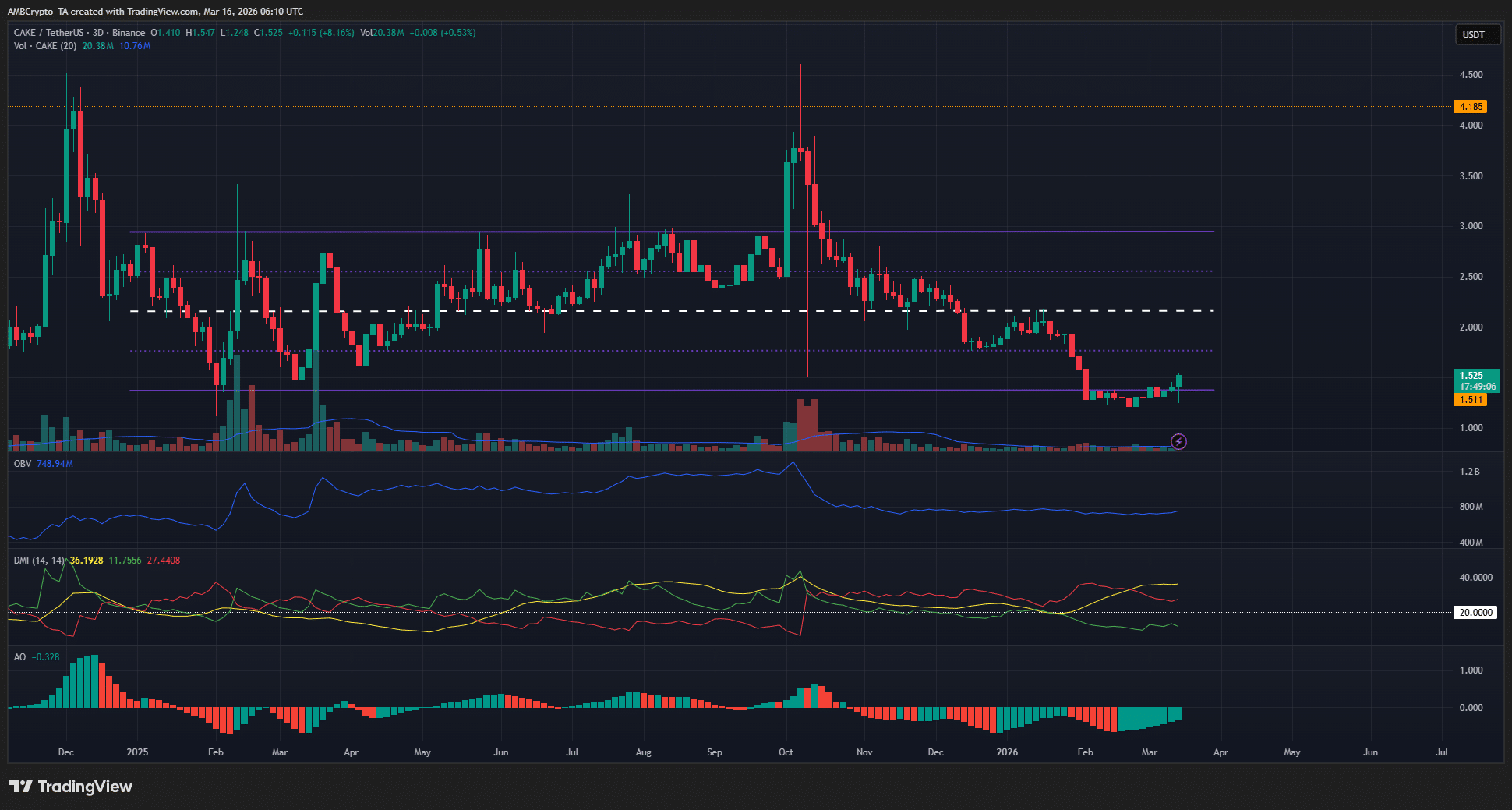 The $1.5 horizontal level has been an important support/resistance since July 2023. In fact, the price action of the past year showed that CAKE bulls were weak.