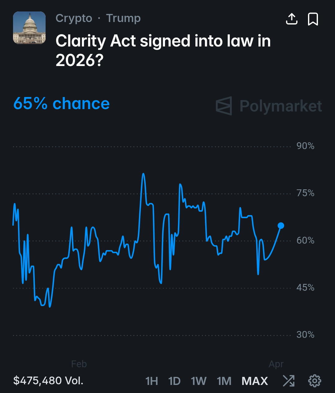 - Polymarket odds rocketed to 65%, reflecting this increased optimism.