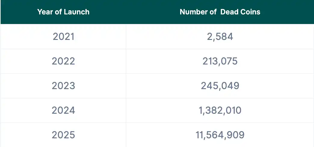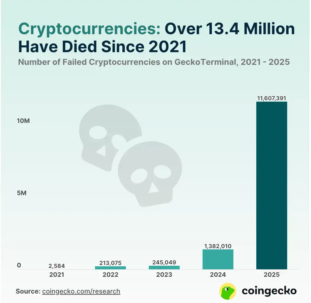 As of December 31, 2025, a total of 11.6 million cryptocurrency projects had failed, setting a new historical record for the number of failed projects in a single year. These failed projects account for 86.3% of all failure cases between 2021 and 2025.