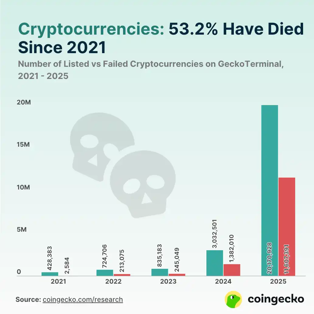 According to data from GeckoTerminal, 53.2% of cryptocurrency projects have failed, with the majority of these failures concentrated in 2025. In 2025 alone, 11.6 million token projects came to an end, accounting for 86.3% of all failed projects. This phenomenon is closely related to the severe market turbulence throughout the year, particularly the impact on the memecoin sector.