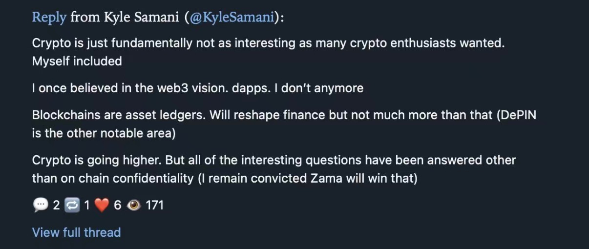 He said: "Crypto is not fundamentally as interesting as many crypto enthusiasts want it to be. I used to believe in the Web3 vision, I used to believe in dApps. I no longer do. Blockchains are primarily asset ledgers. They can reshape finance, but their potential in other areas is limited."