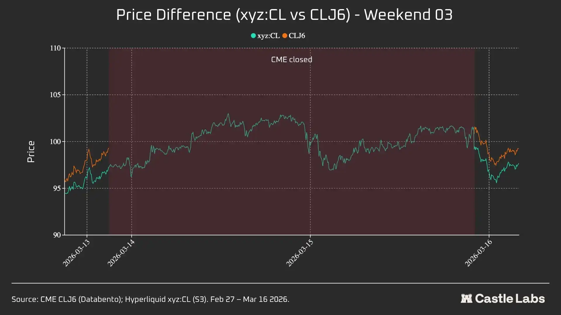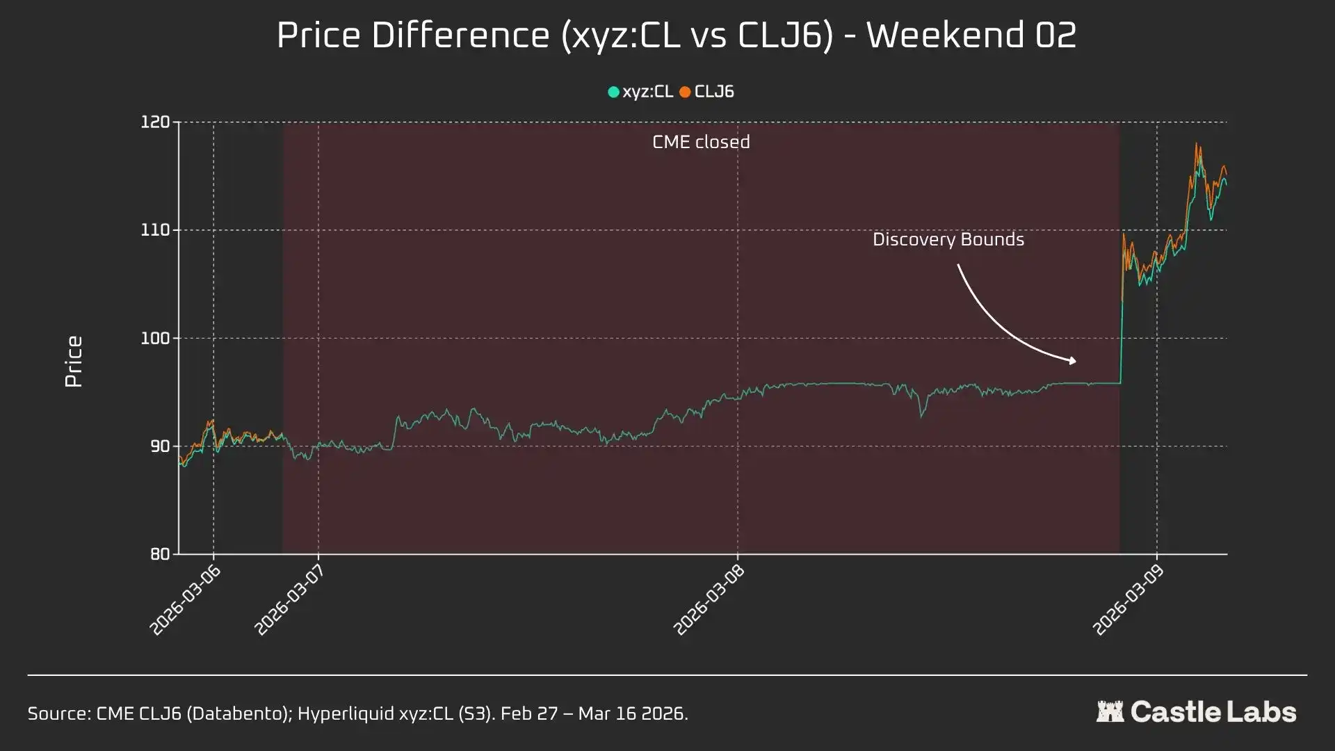 在第二个周末,xyz:CL 更好地捕捉到了市场走势,并且比前一个周末更接近 CME 的开盘价。
