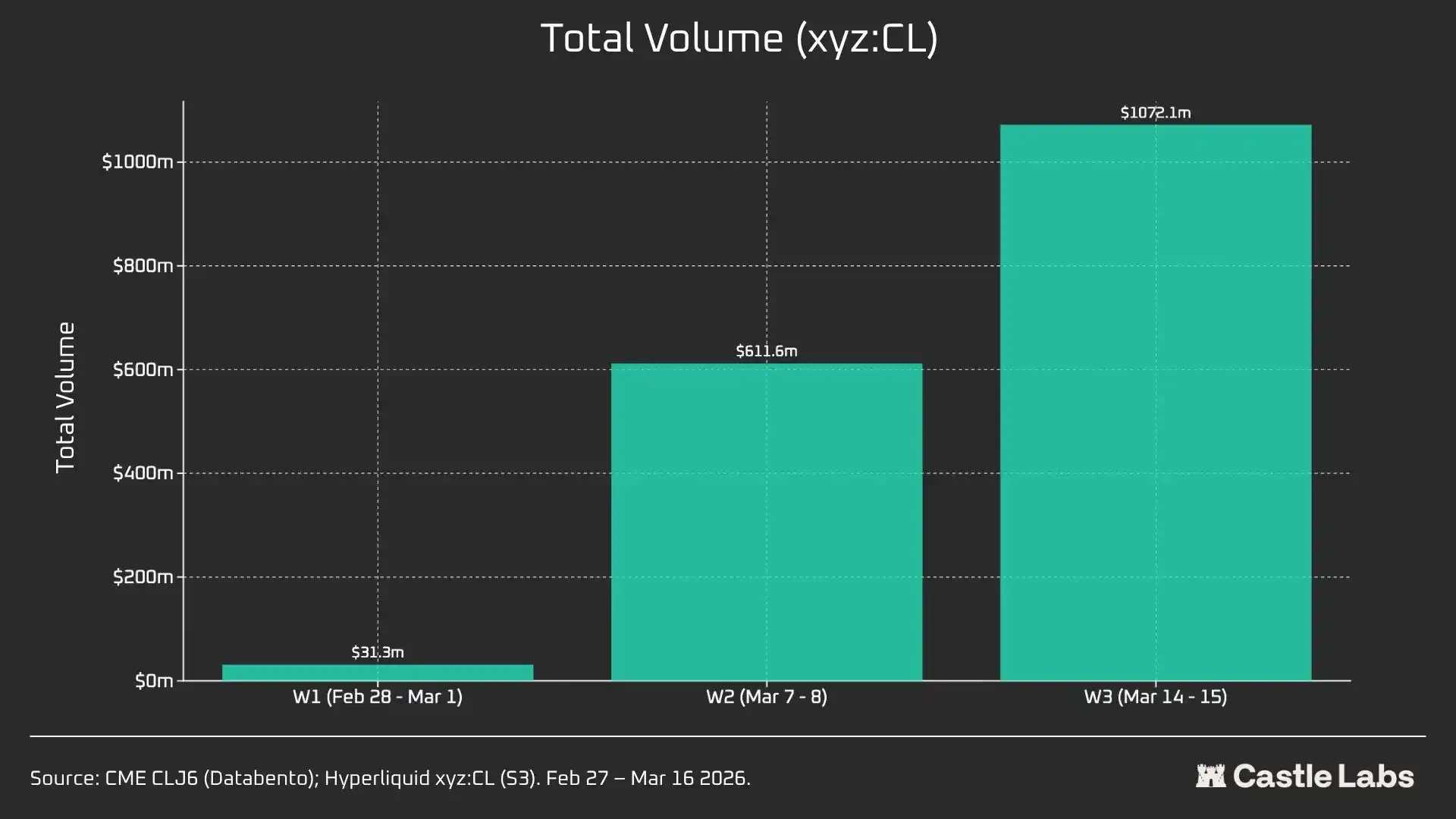 xyz:CL 市场的总交易量在三周内从 3100 万美元增长到超过 10 亿美元,反映出用户数量的增加和市场的最终成熟。