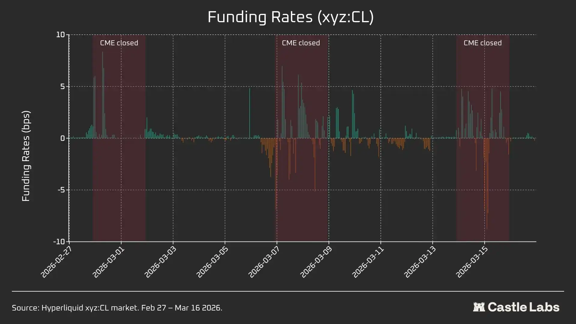 在活跃交易时段,Hyperliquid 的 xyz:CL 与 CME 的 CLJ6 走势密切相关,但随着油价上涨,出现了结构性折价并扩大,这很可能是由累积的多头头寸带来的融资利率压力所致。周末期间,CME 休市,Hyperliquid 的价格发现受到价格区间机制 (DB) 的进一步限制,在没有实时参考市场的情况下,该机制限制了标记价格的波动幅度。
