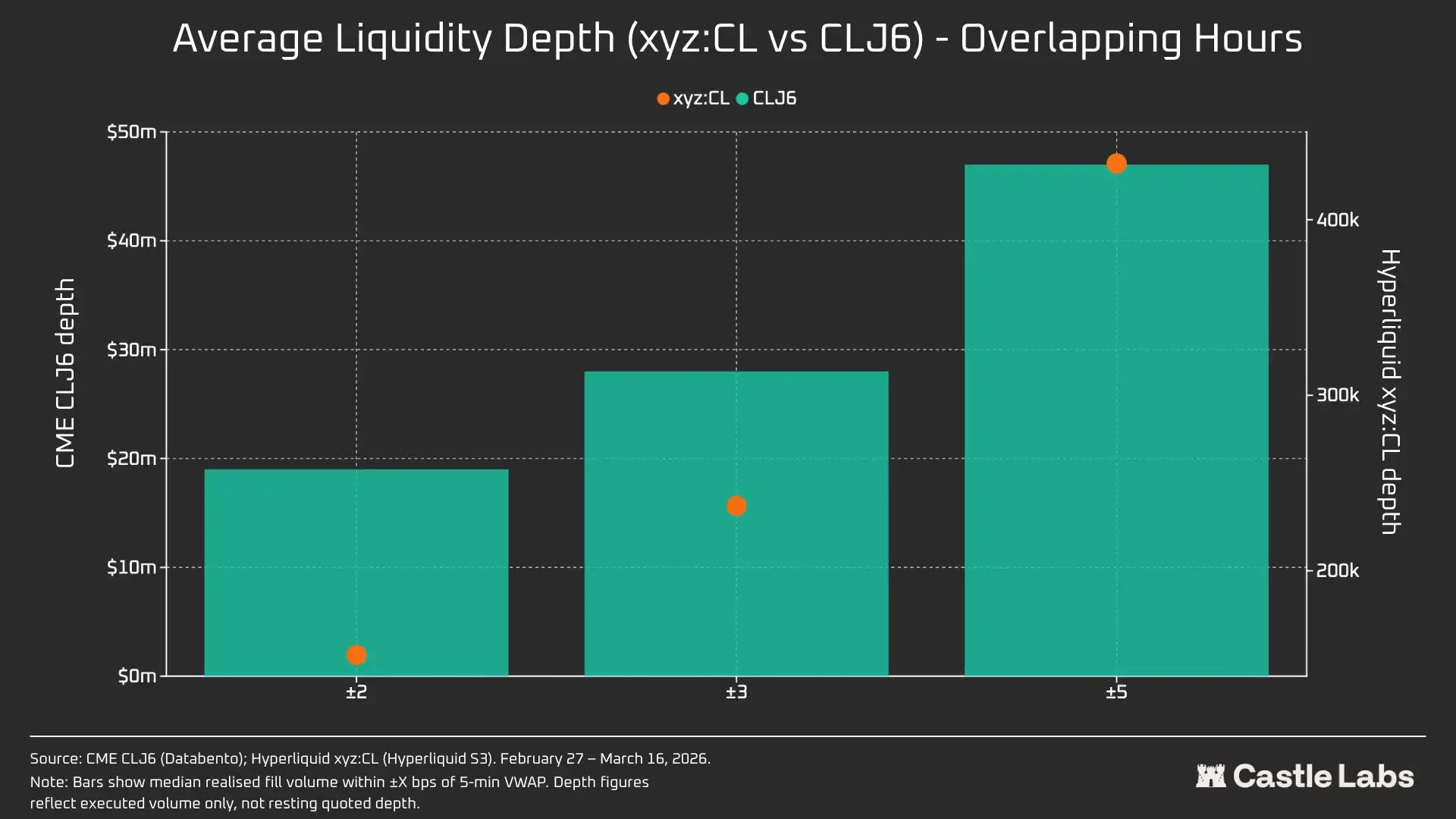 毫无疑问,链上交易所的流动性状况与 CME 截然不同。Hyperliquid 上 CL 的平均流动性深度不到 CLJ6 的 1%,且各价位区间的流动性深度一致(±5 bps 时为 109 倍)。在中点价位 ±2 bps 的区间内,CME 的可执行深度为 1900 万美元,而 Hyperliquid 仅为 15.2 万美元,相差 125 倍。