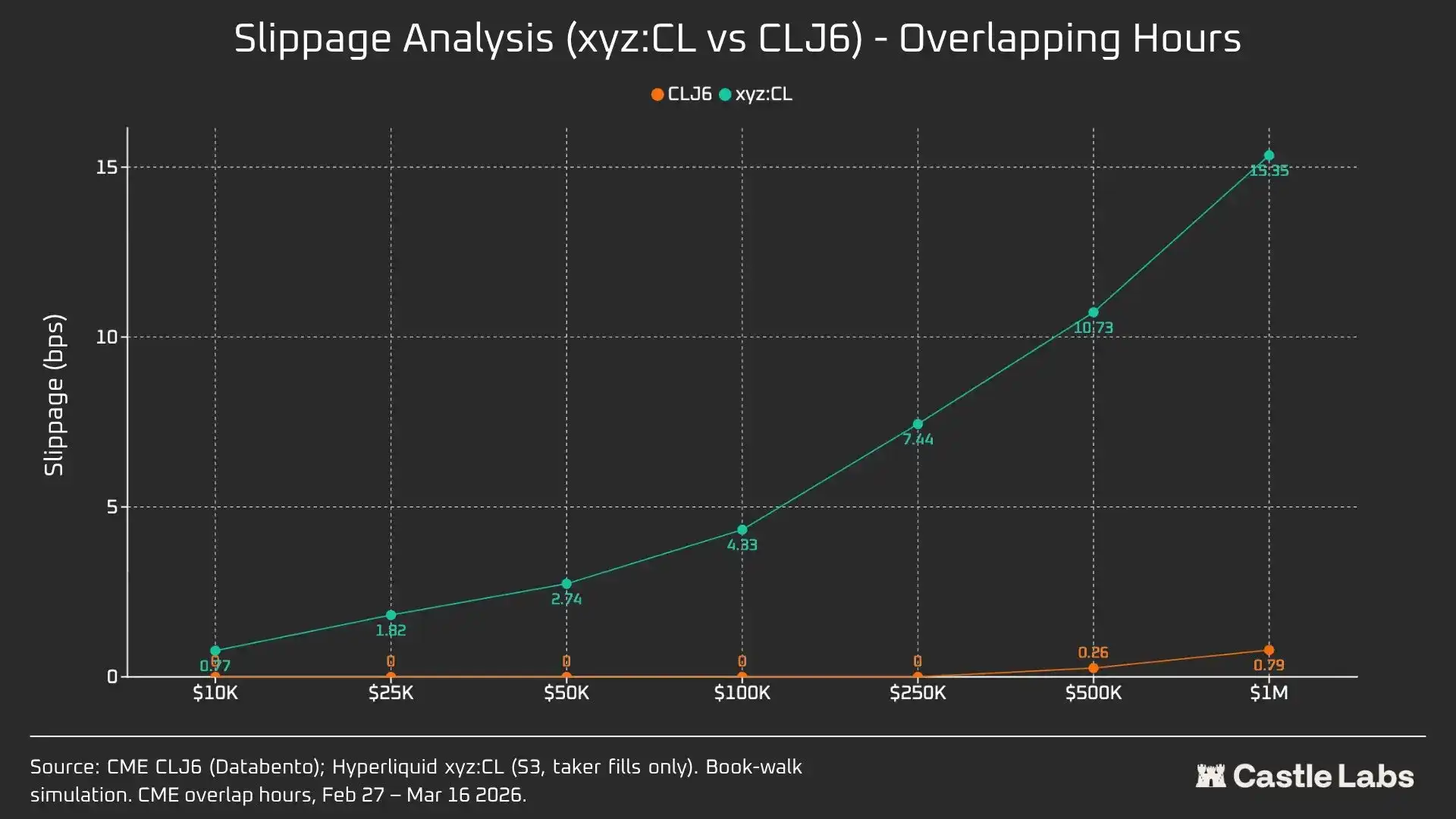 对于 1 万美元的订单,CLJ6 交易者没有滑点,这与预期相符,而 Hyperliquid 用户的中位执行滑点低于 1 个基点,为 0.77 个基点。差距出现在 10 万美元的订单上,此时 Hyperliquid 用户的滑点上升至 4.33 个基点,接近 5 个基点的阈值,而 CME CLJ6 则没有滑点。