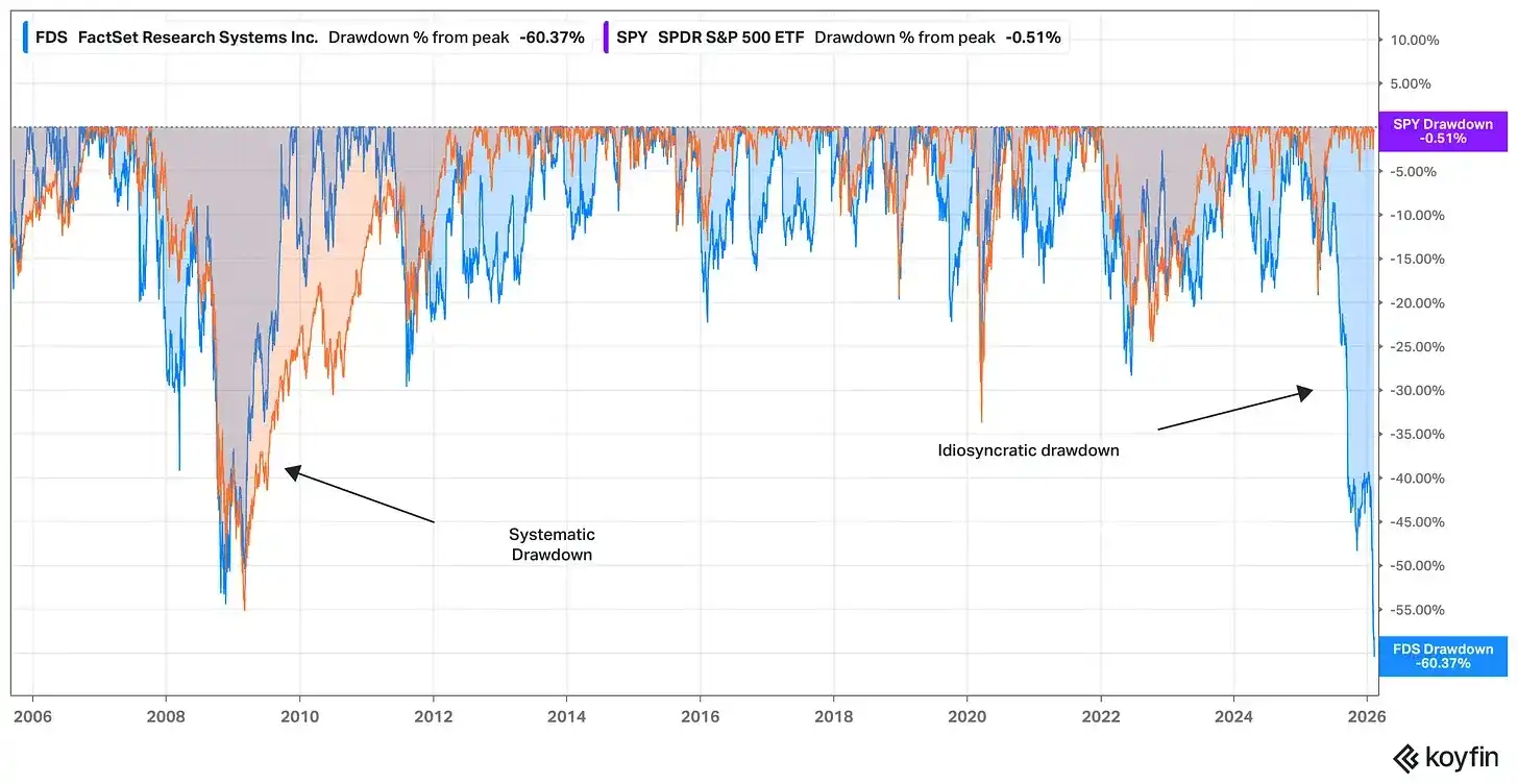 Guide: Academic finance theory categorizes risk into systematic risk and idiosyncratic risk. Similarly, stock drawdowns can also be divided into two types: market-driven systematic drawdowns (such as the 2008 financial crisis) and company-specific idiosyncratic drawdowns (such as the current software stock crash driven by AI concerns).
