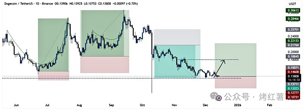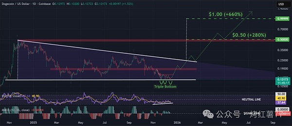 If the price successfully breaks out of the triangle structure upward, the medium-term upside potential could be unlocked. Based on the pattern's height measurement, the theoretical target after a breakout could reach around $0.50 (a gain of approximately 260% from the breakout point), with even a chance to test the $1 mark, representing a potential gain of 680%. However, such a significant rally would require support from the macro environment, such as if the Federal Reserve shifts to quantitative easing policies in 2026, which could significantly boost market risk appetite.