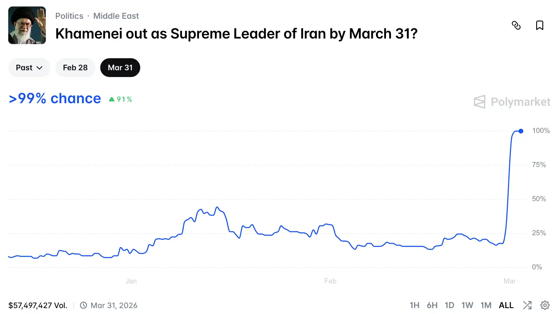 Source: https://polymarket.com/event/khamenei-out-as-supreme-leader-of-iran-by-march-31