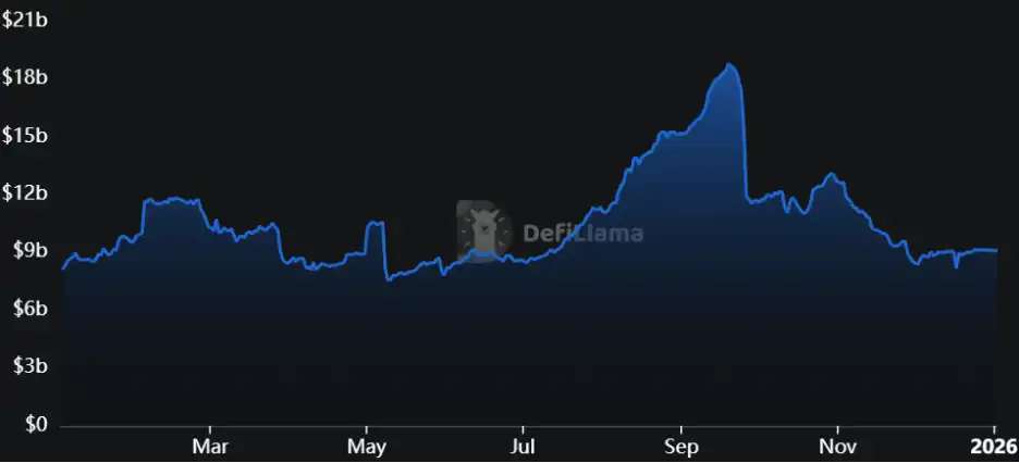 2025 was the year the yield sector leaped from a niche market to DeFi infrastructure. Its TVL rose from $8.1 billion to $9.1 billion, a year-on-year increase of 12.5%, with a yearly high of around $18.8 billion.