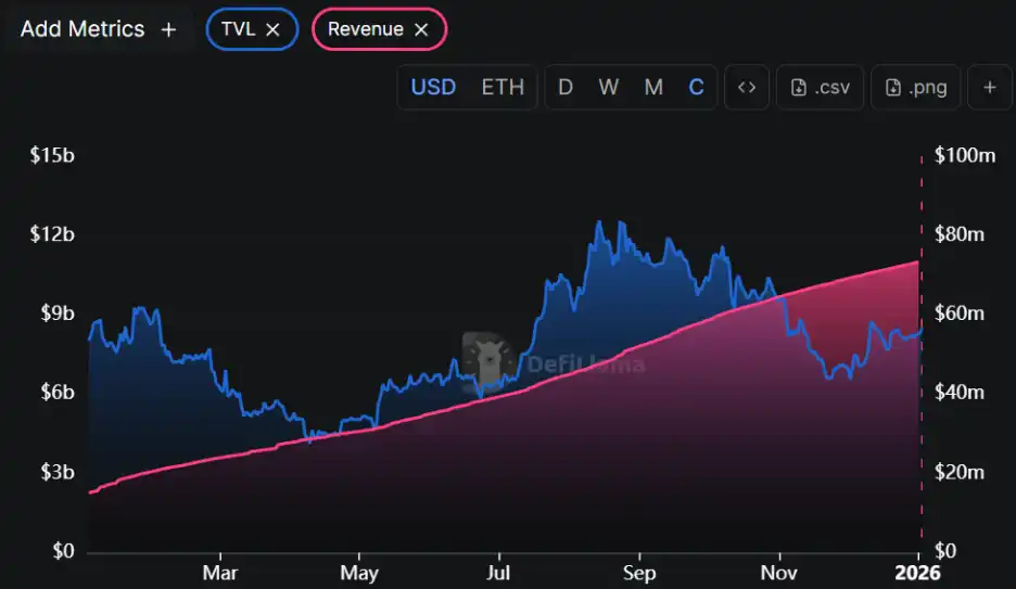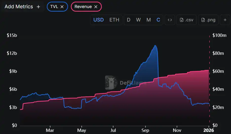 In 2025, Pendle's TVL decreased from $4.3 billion to $3.7 billion, a year-on-year decline of about 13%. However, its cumulative revenue steadily increased from $17.99 million to $61.56 million, a year-on-year growth of 242%, demonstrating the resilience of the protocol's fundamentals. Even during the market downturn, Pendle maintained stable revenue generation capability.