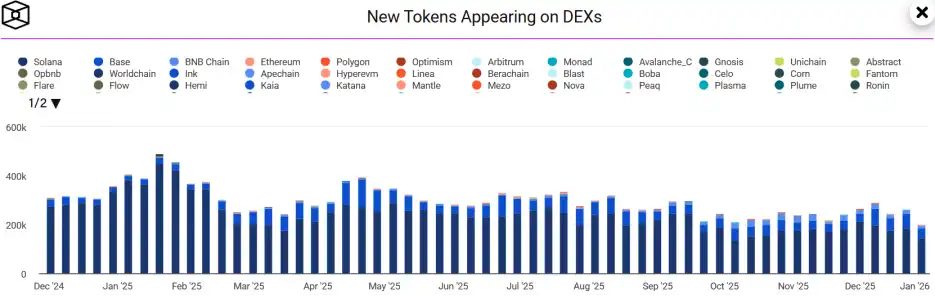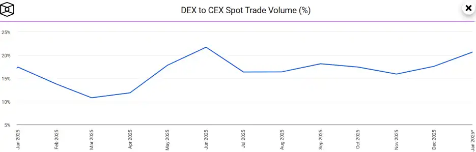 In 2025, user stickiness on DEXes increased significantly. For eight consecutive months, the trading share of DEXes versus CEXes remained above 15%, breaking the pattern of only briefly spiking during bull market peaks in previous years.