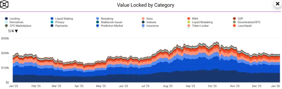 However, a sudden flash crash in Q4, the 10/11 event, poured cold water on this fervor, causing the TVL to shrink sharply to $189.35 billion, wiping out the annual gains to a negligible 3.86%. This剧烈 volatility laid bare the true texture beneath DeFi's glamorous narrative: on one side, the deep evolution of sectors like staking, lending, and RWA; on the other, the fragility built on leverage accumulation and the hidden pain of governance fragmentation.