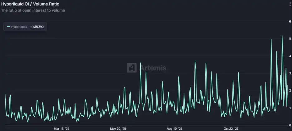 Hyperliquid is the vanguard of the Perp DEX sector. Supporting 200,000 TPS and sub-second settlement, its performance is already on par with mainstream CEXes. Its annual trading volume exploded from $617.5 billion to $3.55 trillion. The protocol's OI/Vol (Open Interest/Volume) ratio长期 (long-term) remained at a high level around 2, indicating that its trades are mostly genuine hedging and trend positions, rather than mere volume farming.