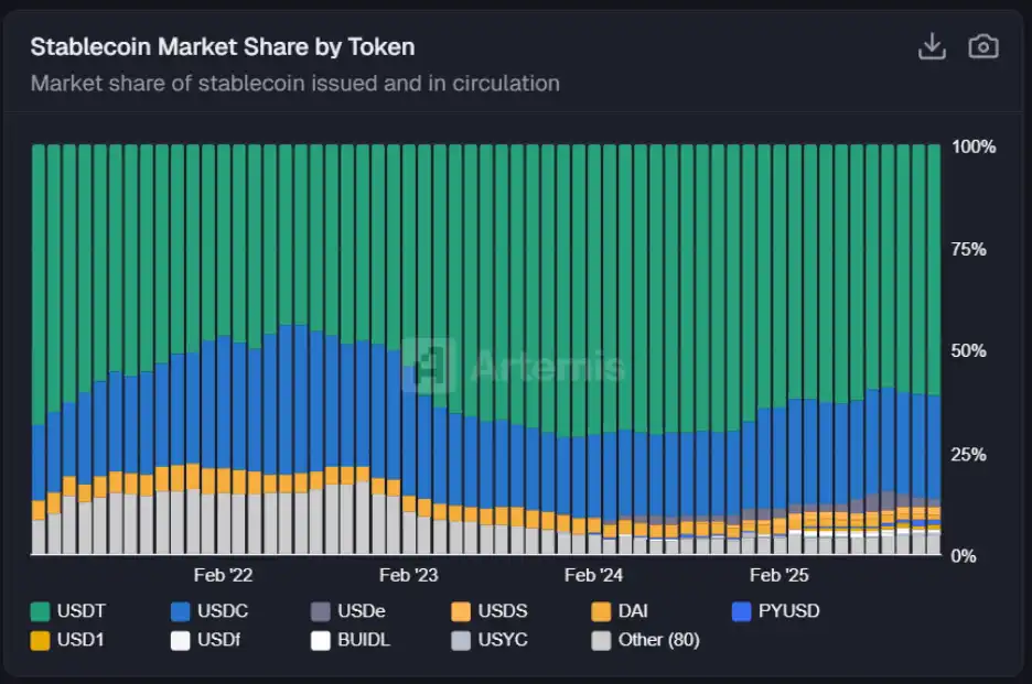 USDT still maintains an absolute lead with over 60% share, while USDC ranks second凭借 (relying on) transparency and compliance.