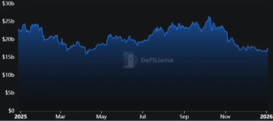In 2025, DEXes continued to accelerate their catch-up with CEXes (Centralized Exchanges) in terms of user experience and liquidity efficiency. The sector's TVL decreased from $22.3 billion to $16.8 billion, a year-on-year decline of about 25%, with a yearly high of $26.6 billion.