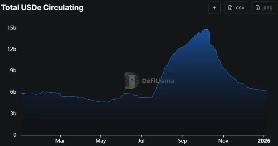 Benefiting from high-leverage循环 (recycling) leverage on Aave and Pendle, the supply of USDe approached 15 billion. However, the flash crash on October 11 caused USDe to脱锚 (depeg) to $0.65 on the Binance spot market at one point. These aftershocks caused USDe's TVL to plummet to $6.3 billion, a 58% shrinkage from its historical high.