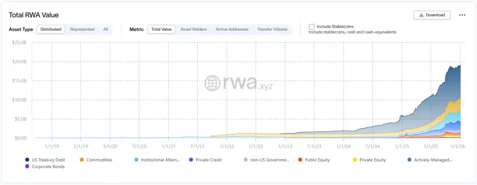 In 2025, the wall between the on-chain market and real-world assets was pushed down faster; it was the year RWA achieved scale. The market capitalization of tokenized assets (excluding stablecoins) soared from $5.6 billion to over $20 billion.