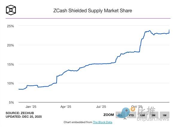 Cuối cùng, đáng chú ý là với tư cách là người tiên phong về quyền riêng tư trong crypto, nguồn cung ẩn danh (anonymous pool) của Zcash đã tăng lên gần 25%, đánh dấu mức độ áp dụng quyền riêng tư trên mạng ngày càng tăng. Zcash cung cấp quyền riêng tư chức năng cho người dùng và có khả năng tuân thủ thông qua việc tiết lộ thông tin có chọn lọc.