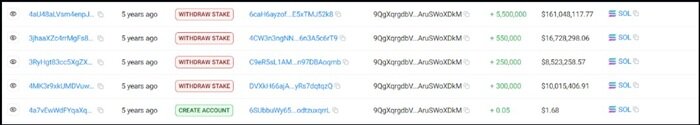 Furthermore, by tracking the history of transactions from Anatoly Yakovenko's staking accounts, it appears that related accounts have conducted large SOL transactions to multiple Solana addresses. For example: between August 2024 and November 2024, over 3 million SOL tokens were unstaked and transferred. Over 1.5 million SOL tokens remain staked across multiple addresses, including 9E8zG, JQ5jC, A6mJn, and 7pgzZ. If these addresses also belong to Anatoly Yakovenko, his SOL holdings would far exceed current estimates, nearing $122 million at current prices.